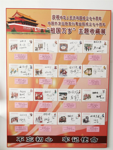 梁京鋼:大家都知道今年是中華人民共和國成立70周年,也是中國外文局成立70周年,是一個非常有意義的時刻,展示工作作為外文局的年度計劃,我在半年前就有所準備,也得到了局領導的支持和扶持。我在做準備的時候就做了一個立意,展出什么?怎么展示?怎么更好地把“祖國萬歲”的題材充分發揮好,能夠達到預期效果?能夠讓觀眾、職工通過觀看提高自己對國家的一種認知,而且增加對祖國的熱愛,弘揚以愛國為榮的意識。