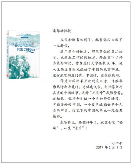 2019年2月,中國國家主席習近平給廈門大學美籍教師潘維廉回信,祝賀他的新書《我不見外—老潘的中國來信》在中國外文局外文出版社出版
