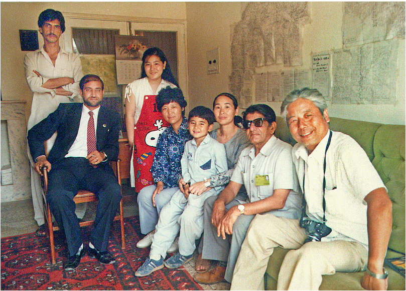 1985年,外文局記者采訪“海上絲路”時,在巴基斯坦朋友家中作客。(右一)人民畫報記者茹遂初,(右五)英文翻譯邊幽芬