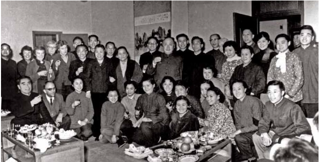1962年,《中國建設》創刊10周年。周恩來(前排左一)、宋慶齡(后排左十一)、陳毅(后排左十三)、鄧穎超(后排左九)與雜志社工作人員聯歡時留影