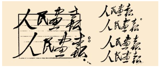 1950年,毛澤東主席為新創刊的《人民畫報》題寫的刊名手跡。當時,他分別在兩張紙上題寫了六條,并在他最滿意的一條右上方畫了兩個圈,這便是被一直沿用至今的《人民畫報》刊名