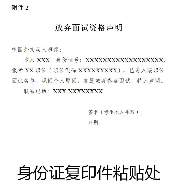 放棄面試的考生請填寫《放棄公務員面試的聲明》(詳見附件2),經本人簽名,于8月14日17時前傳真至010-68990820或發送掃描件至shwyuan@cipg.org.cn。未在規定時間內填報放棄聲明,又因個人原因不參加面試的,視情節將上報中央公務員主管部門記入誠信檔案。