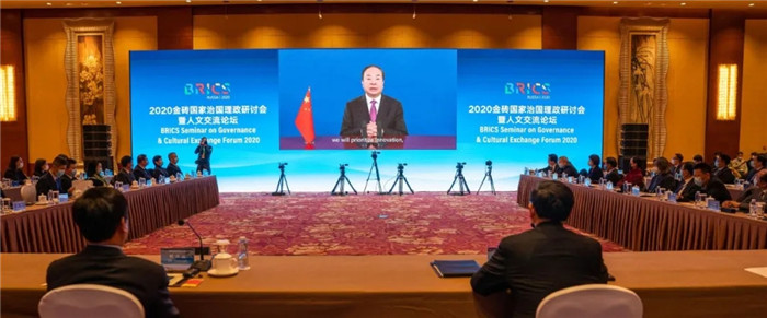 開幕式后,2020金磚國家治國理政研討會和金磚國家人文交流論壇分別進行了主題發言和分議題發言。中國外文局局長杜占元在治國理政研討會發表主題演講時指出,“金磚國家”由概念演化為組織且不斷發展,源于五個國家代表了世界的新興力量,以新的視角共同圍繞全球重大問題提出新的觀點,給出新的解決方案,推動全球治理改革的新發展。金磚國家應以創新催生新理念,擺脫定勢思維;以創新開辟新領域,打破零和博弈;以創新探索新機制,跳出線性路徑;以創新培育新動能,推動經濟復蘇。副局長陸彩榮出席人文交流論壇并在閉幕式作總結發言。副局長兼總編輯高岸明、副局長于濤分別主持治國理政研討會平行會議并作總結發言。