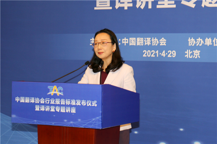 4月29日,中國譯協行業報告、行業標準發布儀式暨譯講堂專題講座在北京舉行,中國外文局副局長兼總編輯高岸明、中國標準化研究院副院長李愛仙出席發布儀式并致辭。中國外文局當代中國與世界研究院院長于運全,局國際合作部主任、中國翻譯協會常務理事、常務副秘書長姜永剛,中國翻譯協會副會長何恩培分別發布《2020中國語言服務行業發展報告》《司法翻譯服務規范》及《口筆譯服務計價指南》。