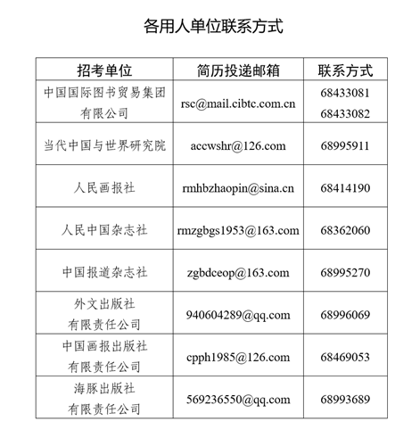 (一)報名。有意報考者請訪問中國外文出版發行事業局官方網站(http://www.cipg.org.cn/),并于2021年5月31日8:30至6月14日24:00期間通過郵箱投遞簡歷。用人單位的簡歷投遞郵箱和聯系方式見附件。