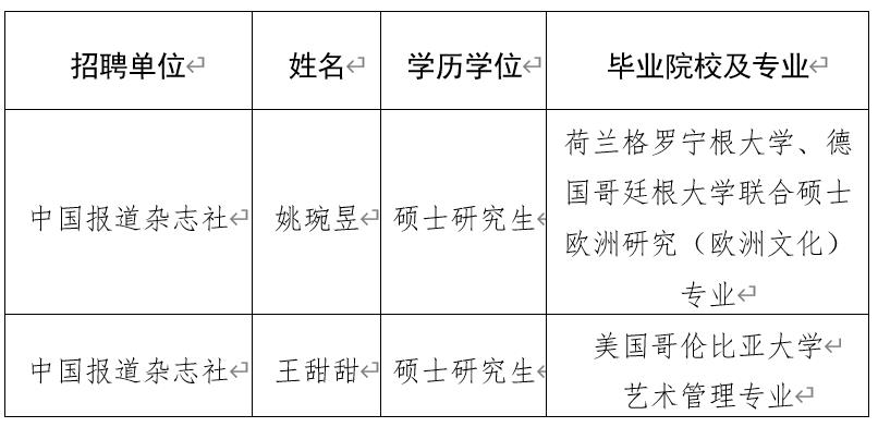 根據有關規定和《中國外文出版發行事業局所屬企事業單位2021年海外留學生招聘簡章》,現將中國外文局中國報道雜志社2021年度擬接收海外留學生予以公示。公示期間,如有問題,請向中國外文局反映。