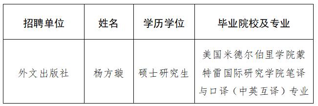 根據有關規定和《中國外文出版發行事業局所屬企事業單位2021年海外留學生招聘簡章》,現將中國外文局外文出版社2021年度擬接收海外留學生予以公示。公示期間,如有問題,請向中國外文局反映。