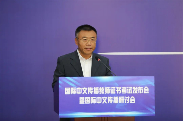 中國外文局教育培訓中心主任范奎耀和對外經濟貿易大學黨委副書記文君分別對國際中文傳播教師證書考試,以及考試委員會、評審專家委員會、教材編寫委員會的建設與人員構成等情況進行了發布和介紹。