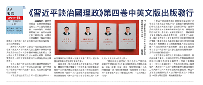7月3日,由中央宣傳部(國務院新聞辦公室)會同中央黨史和文獻研究院、中國外文局編輯的《習近平談治國理政》第四卷中英文版在香港發行。