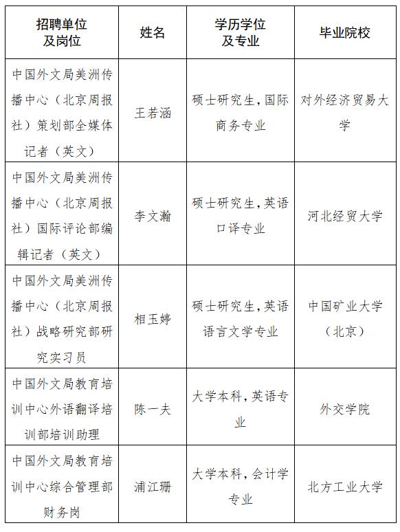根據事業單位公開招聘工作有關規定和《中國外文局所屬企事業單位2022年度公開招聘工作人員公告》,現將中國外文局所屬中國外文局美洲傳播中心(北京周報社)、中國外文局教育培訓中心2022年度擬聘用事業單位工作人員予以公示。公示期間,如有問題,請向中國外文局反映。