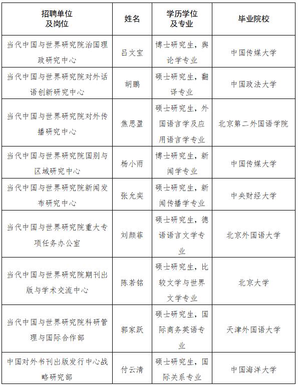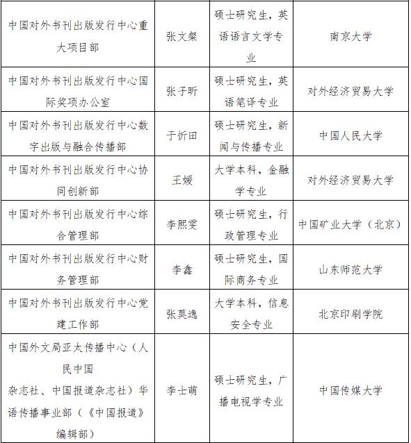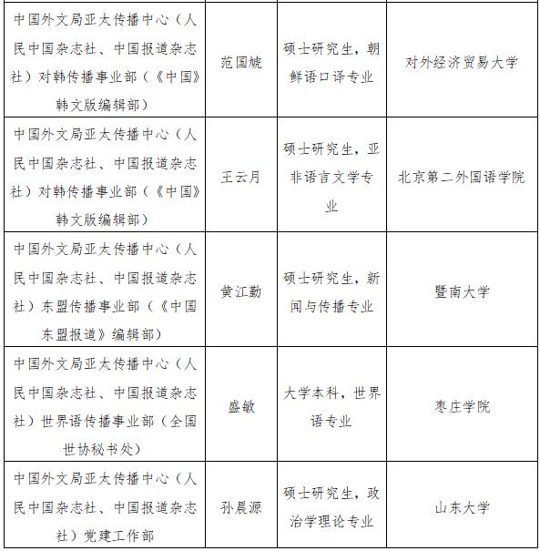 根據事業單位公開招聘工作有關規定和《中國外文局所屬企事業單位2022年度公開招聘工作人員公告》,現將中國外文局所屬當代中國與世界研究院、中國對外書刊出版發行中心、中國外文局亞太傳播中心(人民中國雜志社、中國報道雜志社)2022年度擬聘用事業單位工作人員予以公示。公示期間,如有問題,請向中國外文局反映。