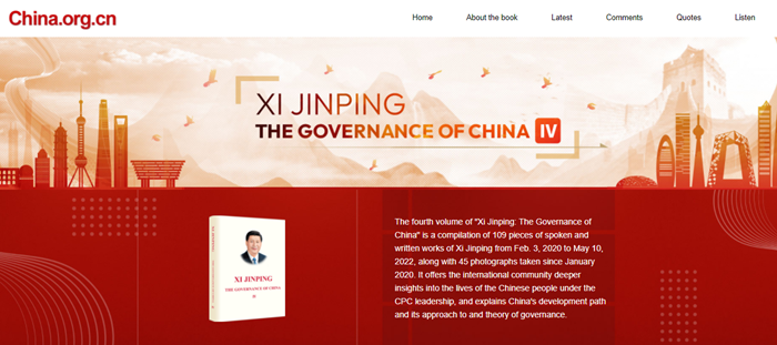 7月22日,中國網宣介闡釋《習近平談治國理政》第四卷英文專題正式上線。該專題以紅色為主色調,設置“最新動態(Latest)”“解讀(Comments)”“金句(Quotes)”“誦讀(Listen)”“延伸閱讀(Other Volumes)”等欄目,立體呈現《習近平談治國理政》第四卷重點內容,展現中國故事及其背后的思想力量和精神力量。專題上線3天,全渠道瀏覽量超50萬。
