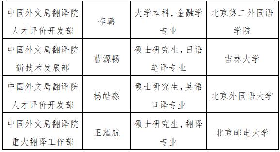 根據企事業單位公開招聘工作有關規定和《中國外文出版發行事業局所屬企事業單位2022年度公開招聘工作人員公告》,現將中國外文局所屬當代中國與世界研究院、中國外文局中東歐與中南亞傳播中心(人民畫報社)、外文出版社有限責任公司、中國外文局翻譯院2022年度擬聘用工作人員予以公示。公示期間,如有問題,請向中國外文局反映。
