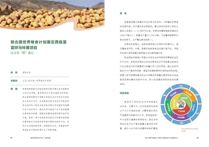 聯合國世界糧食計劃署定西臨夏富鋅馬鈴薯項目是本書收錄的案例之一。聯合國世界糧食計劃署駐華代表屈四喜表示,世界糧食計劃署是中國農業農村發展和脫貧攻堅事業的參與者、貢獻者和見證者。我們愿與甘肅省加強合作,共同探索實現農業農村可持續發展的創新途徑,并將甘肅乃至中國的成功經驗和適用技術分享給其他發展中國家,幫助他們提升糧食安全和營養水平。