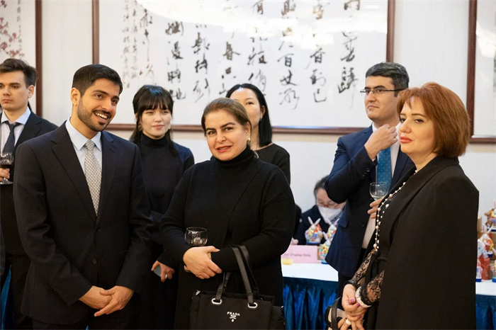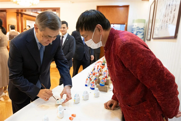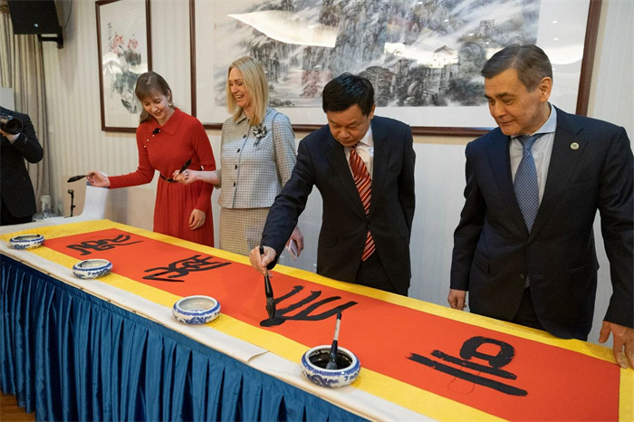 招待會上,駐華使節共同欣賞傳統藝術表演,體驗北京泥彩塑、膠州剪紙等非遺技藝,并共寫書法長卷,感受中國傳統春節習俗。與會嘉賓互道節日祝福,暢談未來合作與發展愿望,現場掌聲、音樂聲、歡笑聲此起彼伏,充滿了喜樂祥和的節日氣氛。