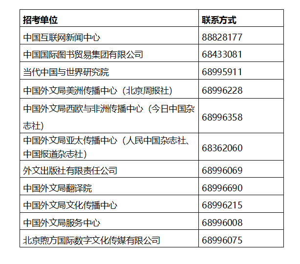 中國外文局下轄21家直屬單位。本次公開招聘涉及中國互聯網新聞中心、中國國際圖書貿易集團有限公司、當代中國與世界研究院、中國外文局美洲傳播中心(北京周報社)、中國外文局西歐與非洲傳播中心(今日中國雜志社)、中國外文局亞太傳播中心(人民中國雜志社、中國報道雜志社)、外文出版社有限責任公司、中國外文局翻譯院、中國外文局文化傳播中心、中國外文局服務中心、北京煦方國際數字文化傳媒有限公司共11家企事業單位。