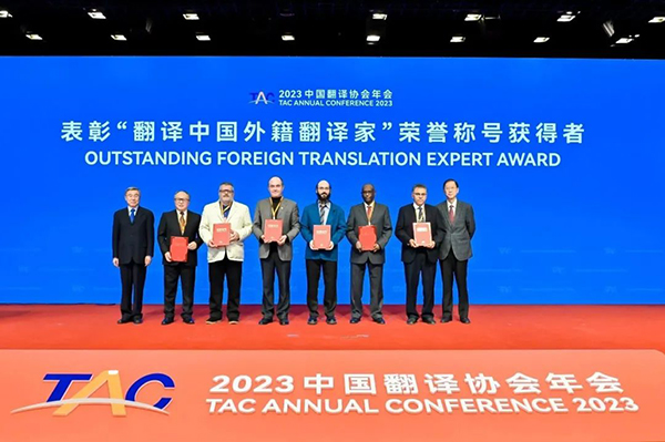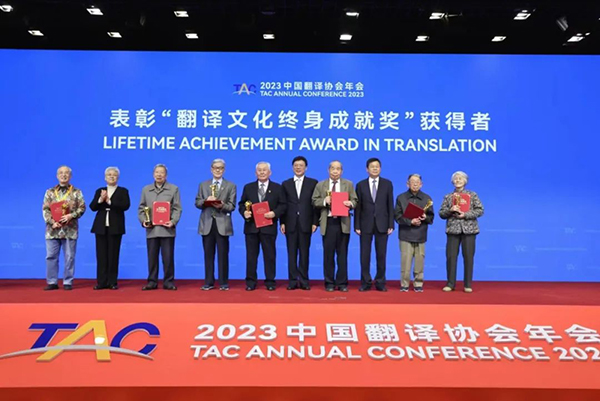 4月3日,由中國外文局指導、中國翻譯協會主辦的2023中國翻譯協會年會在北京召開。開幕會上舉行了“翻譯文化終身成就獎”“資深翻譯家”“翻譯中國外籍翻譯家”表彰儀式,11位翻譯家榮獲“翻譯文化終身成就獎”,115名翻譯家被授予“資深翻譯家”榮譽稱號,6位翻譯家被授予“翻譯中國外籍翻譯家”榮譽稱號。