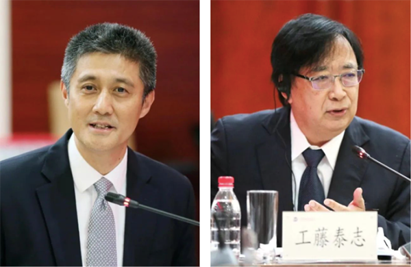 中國外文局副局長兼總編輯、論壇中方執行委員會副主任兼秘書長高岸明(左)與論壇日方執行委員會委員長、言論NPO理事長工藤泰志(右)共同主持會議