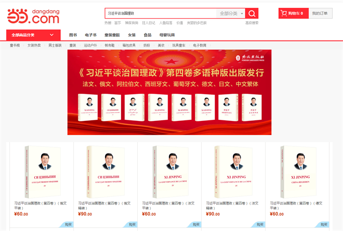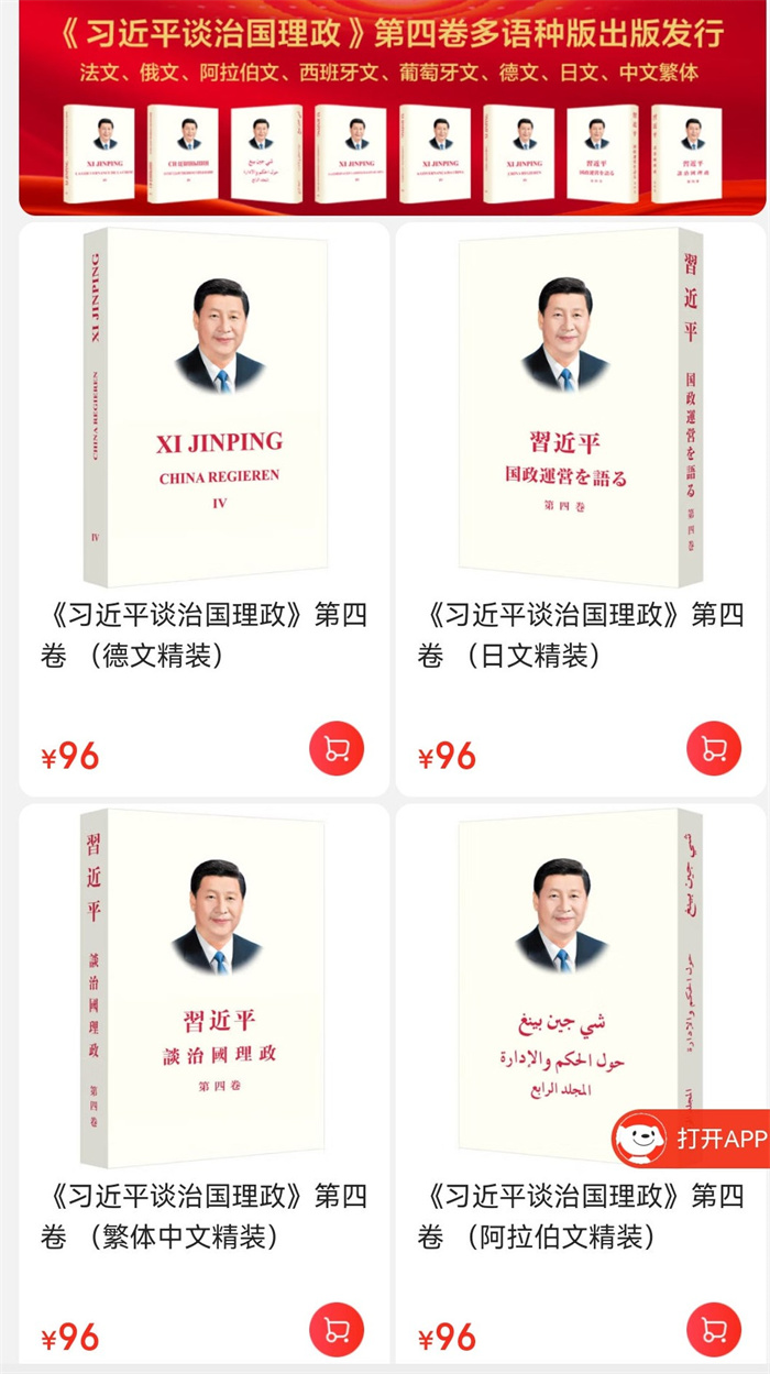 6月11日正式出版發布后,《習近平談治國理政》第四卷多語種版已在全國各大中心書城和網站上架銷售,以下為各地主要書城和網站重點銷售展陳的場面。