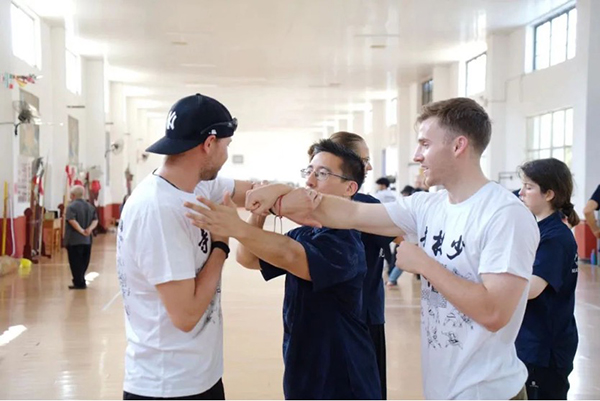 在練功房,教練們進行了精彩的表演。在太極和螳螂拳的展示中,每個動作都充滿了柔和而均衡的力量,教練獨特的身法和流暢的動作讓外籍青年們贊嘆不已。詠春拳快速連貫的技法以及精準的拳腳配合,每個招式都流暢有力,凝聚著詠春拳特有的爆發力和實用性。在交流中外籍青年了解到,傳統武術精神是儒家思想的體現,也是自強不息的民族精神的體現?!斑@真的太酷了!我要拜師!”來自智利的新聞編輯大衛在觀賞完表演后激動地說道。