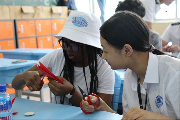 在非遺文化課堂上,外籍青年們體驗了歷史悠久的剪紙藝術。剪紙老師以獨具文化特色的“百變團花”為例,讓外籍青年們初步感受了窗花剪紙的藝術——從紙的折疊到剪刀的運用,逐一講解、示范,大家聽得專注,學得認真,收獲了一幅屬于自己的充滿膠東地域文化特色的剪紙作品。