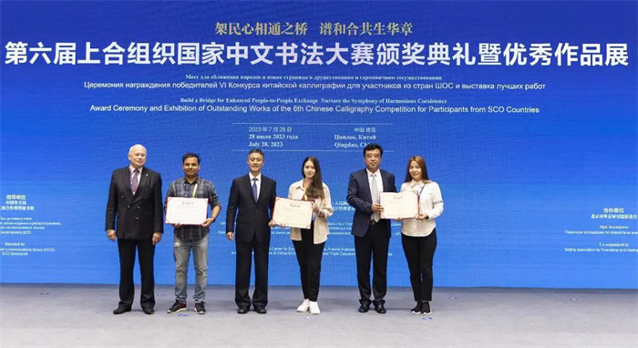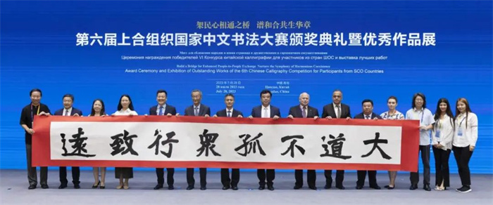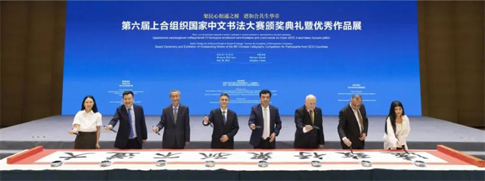 7月28日,由中國外文局、上海合作組織秘書處指導,中國外文局中東歐與中南亞傳播中心(人民畫報社)、中國—上海合作組織地方經貿合作示范區管理委員會共同主辦,北京對外友好交流促進會協辦的“第六屆上合組織國家中文書法大賽頒獎典禮暨優秀作品展”在青島·上合之珠國際博覽中心舉行。