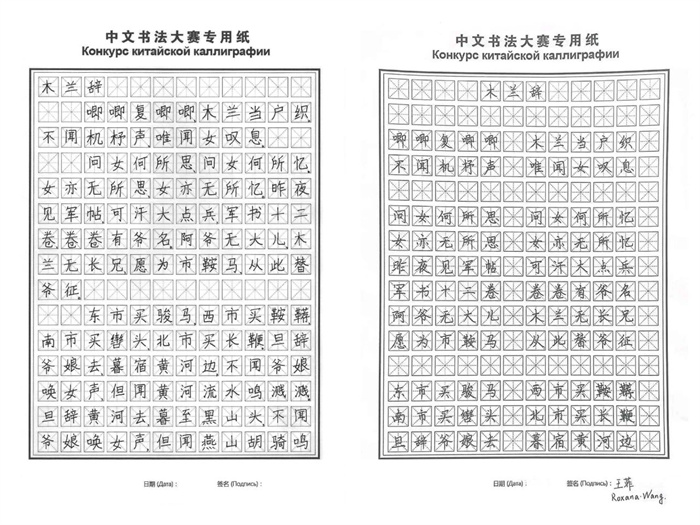 毛筆組一等獎作品,獲獎者分別為成榮(俄羅斯)、俞威(白俄羅斯)