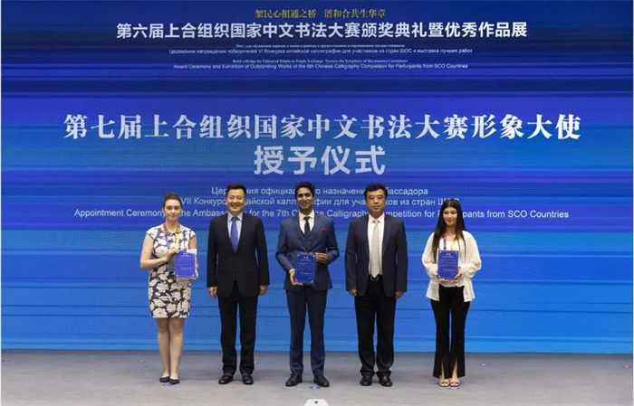 三位來自上合組織國家的書法愛好者被授予“第七屆上合組織國家中文書法大賽”形象大使稱號