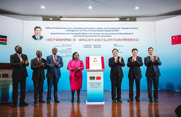 中宣部分管日常工作的副部長、文化和旅游部部長胡和平,中國外文局局長杜占元,中國駐肯尼亞大使周平劍,肯尼亞旅游、野生動物和遺產部長佩尼娜·馬隆扎等中肯嘉賓共同為《習近平談治國理政》第一卷斯瓦希里文版新書揭幕。