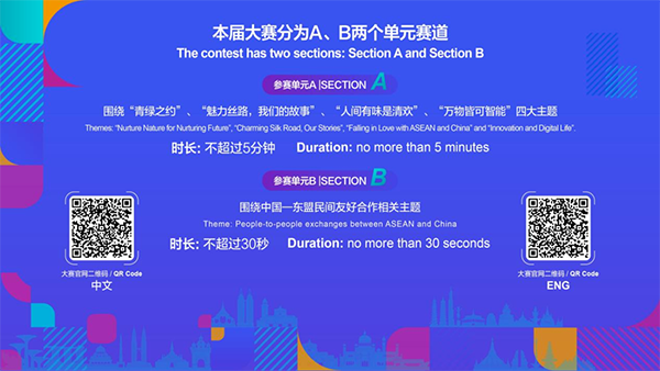 本屆大賽主題為“心心相連 筑夢未來”,分為兩個參賽單元,征集主題包括“青綠之約”“魅力絲路,我們的故事”“人間有味是清歡”“萬物皆可智能”以及中國—東盟民間友好合作等相關主題,旨在通過多形式、多語種的短視頻作品,促進中國與東盟各國之間的人文交流,助力中國—東盟合作進一步深化。