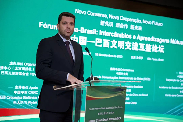 當地時間9月16日,第二屆中國—巴西文明交流互鑒論壇在巴西圣保羅舉行。論壇主題為“新共識、新合作、新未來”。中國外文局副局長劉大為、巴西文化部國際事務特別顧問總協調員維尼修斯·古特勒·羅薩出席論壇并致辭,中國政府拉美事務特別代表邱小琪、中國駐巴西大使祝青橋、巴西駐華大使高望發表視頻致辭。中國中車董事長孫永才、中國美術館館長吳為山、巴西瓦加斯基金會法學院國際交流部主任羅德里戈·維安那作大會發言。中國駐圣保羅副總領事田玉震等中巴政府、智庫、媒體、青年代表約100人出席活動。