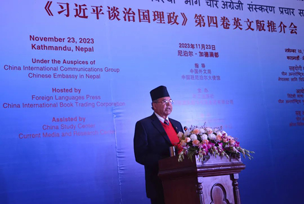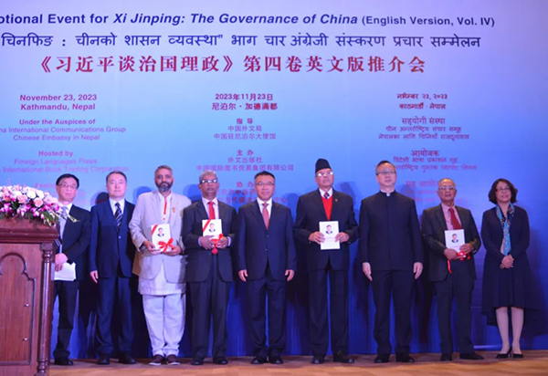 當地時間11月23日,在2023尼泊爾南亞國際書展期間,由中國外文局、中國駐尼泊爾大使館指導,外文出版社、中國國際圖書貿易集團公司主辦,尼泊爾中國研究中心、尼泊爾當代媒體和研究中心協辦的《習近平談治國理政》第四卷英文版推介會在加德滿都舉辦。