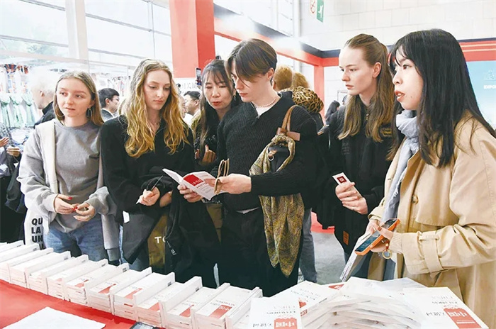 當地時間2023年4月27日,中國外文局在第117屆法國巴黎國際博覽會上舉辦“遇·鑒中國”中華文化主題展及系列文化交流活動。圖為中外青年在展覽現場關注“中國關鍵詞”全系列多語種主題圖書。中新社記者李洋/攝