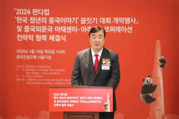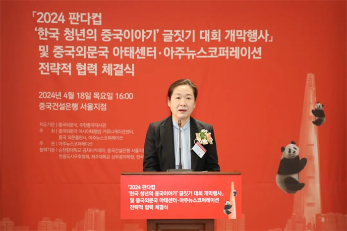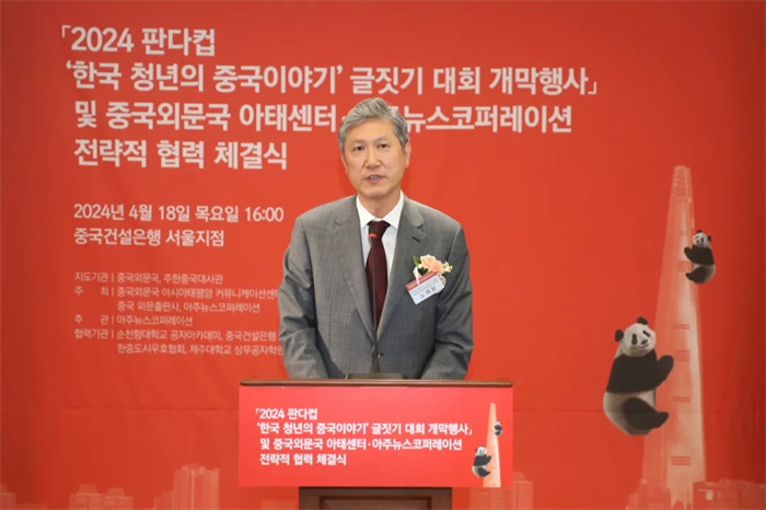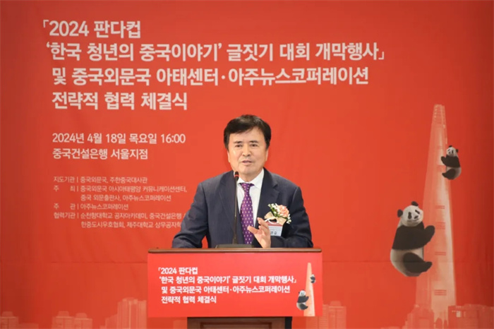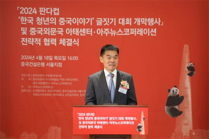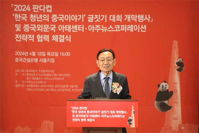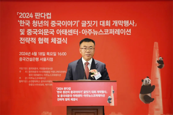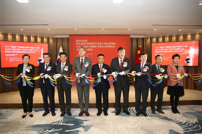 4月18日,2024“熊貓杯”韓國青年感知中國征文大賽啟動儀式在韓國首爾舉行。中國外文局副局長劉大為、中國駐韓國大使邢海明、韓國東亞文化中心院長盧載憲、韓國亞洲新聞集團會長郭永吉、韓國順天鄉大學孔子學院中方院長趙華、中國外文局亞太傳播中心主任陳文戈、韓國亞洲新聞集團旗下《亞洲日報》社長梁圭鉉等中韓嘉賓,以及往屆大賽獲獎韓國青年代表、中韓媒體記者等50余人出席啟動儀式。外文出版社副社長賈秋雅主持啟動儀式。