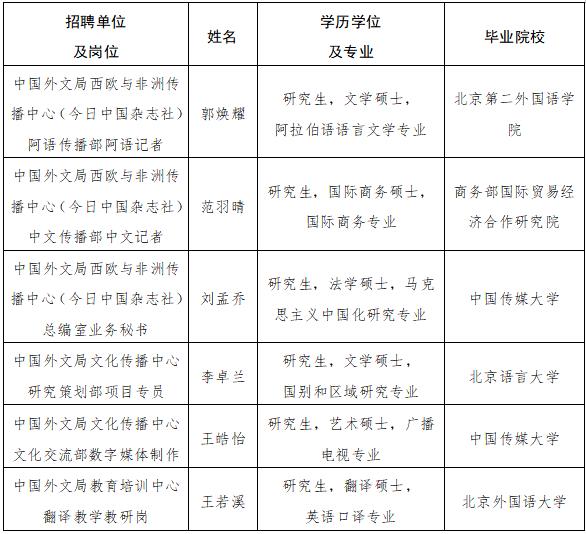 根據事業單位公開招聘工作有關規定和《中國外文局所屬企事業單位2024年度公開招聘工作人員公告》,現將中國外文局所屬中國外文局西歐與非洲傳播中心(今日中國雜志社)等3家單位2024年度擬聘用事業單位工作人員予以公示。公示期間,如有問題,請向中國外文局反映。