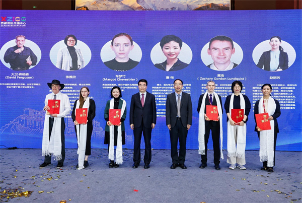 大衛·弗格森(左一)、車夢竹(左二)、黃浩(右三)3名外籍專家被聘為“西藏國際傳播特聘專家”