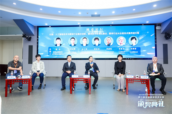 圓桌論壇環節,北京外國語大學高級翻譯學院教授王華樹,大連外國語大學高級翻譯學院副院長、教授王少爽,北京語言大學高級翻譯學院副教授韓林濤,北京語智云帆科技有限公司總經理師建勝,小牛翻譯總裁、創始合伙人張春良,傳神語聯副總裁閆栗麗圍繞人工智能技術與翻譯行業融合創新、翻譯技術標準化建設、翻譯行業從業者技術素養提升等議題進行探討交流。