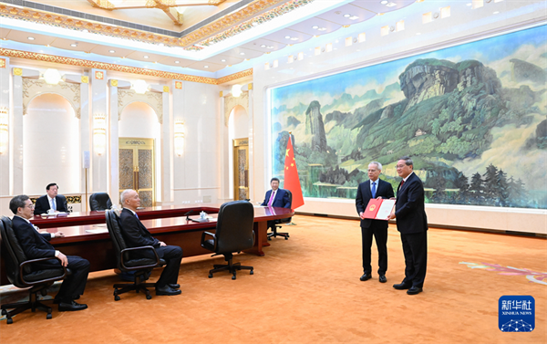 11月1日下午,國家主席習近平在北京人民大會堂會見新當選并獲中央政府任命的澳門特別行政區第六任行政長官岑浩輝。這是在習近平的見證下,國務院總理李強向岑浩輝頒發任命他為中華人民共和國澳門特別行政區第六任行政長官的國務院第794號令。(新華社記者 申宏 攝)