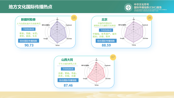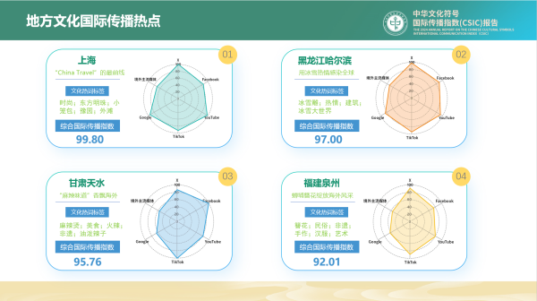 此外,報告列舉了2024年在國際上有影響力的地方文化國際傳播七個熱點,分別是:“China Travel”的最前線(上海)、用冰雪熱情感染全球(黑龍江哈爾濱)、“麻辣味道”香飄海外(甘肅天水)、蟳埔簪花綻放海外風采(福建泉州)、人與自然和諧共生的新典范(新疆阿勒泰)、中軸線申遺成功展現東方古都的文化脊梁(北京)以及千年古城的建筑之美(山西大同)。