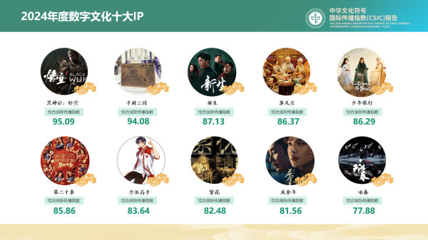 在綜合考慮文化傳播深度、文化創新性與適應性、文化影響力、受眾反饋等因素的基礎上,結合國際傳播指數模型,報告提煉出“2024年度數字文化十大IP”,依次為《黑神話:悟空》《卡游三國》《新生》《落凡塵》《少年歌行》《第二十條》《全職高手》《繁花》《慶余年》和《詠春》,涵蓋電影、電視劇、游戲、潮玩、網文、動漫、舞劇等多種數字文化傳播載體。