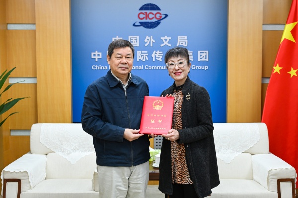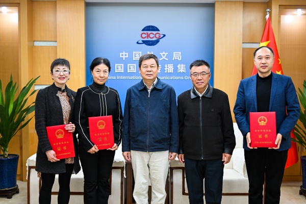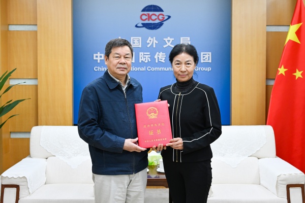 3月13日,中國外文局舉行2024年度享受政府特殊津貼專家頒獎儀式。局長杜占元為入選政府特殊津貼專家中國外文局美洲傳播中心(北京周報社)黨委書記、主任李雅芳,中國外文局所屬新星出版社黨支部書記、社長馬汝軍,中國外文局西歐與非洲傳播中心(今日中國雜志社)英語傳播部譯審、首席定稿人孫雷頒發證書,副局長劉大為出席頒獎儀式。
