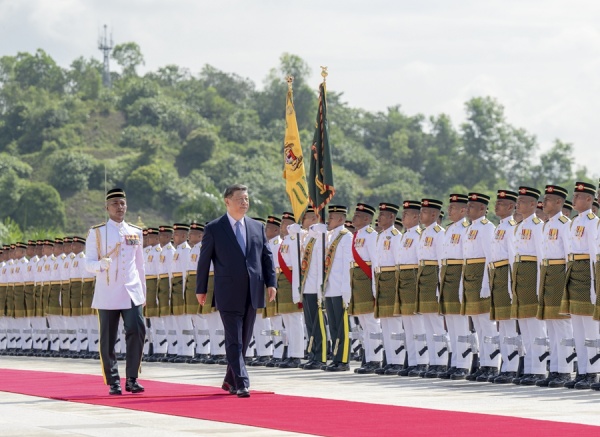 習近平乘車抵達時,易卜拉欣和馬來西亞總理安瓦爾在下車處熱情迎接。兩國元首登上檢閱臺,軍樂團奏中馬兩國國歌,鳴禮炮21響。習近平檢閱儀仗隊。兩國元首進入國家王宮大廳,同雙方陪同人員握手致意。