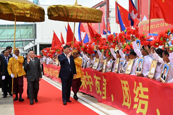 習近平乘車從機場赴下榻飯店途中,中柬兩國國旗迎風飄揚。兩萬余名當地民眾以及華僑華人、中資企業和留學生代表簇擁在街道兩旁,揮舞中柬國旗,手持兩國領導人照片,熱烈歡迎習近平到訪。