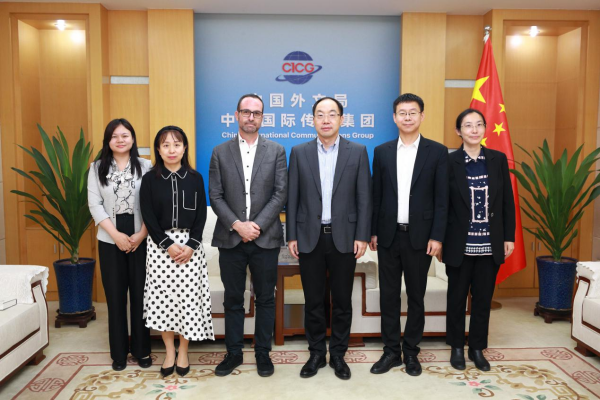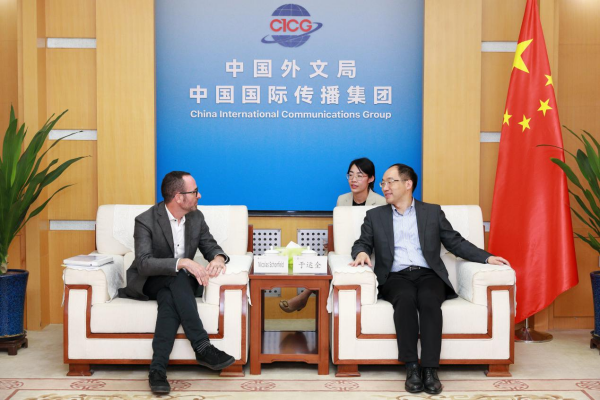 5月14日,中國外文局副局長于運全會見到訪的拉美公共電視網執行主席尼古拉斯·申菲爾德,中國外文局國際合作部、當代中國與世界研究院、中國對外書刊出版發行中心、中國外文局美洲傳播中心(北京周報社)有關負責同志參加會見。
