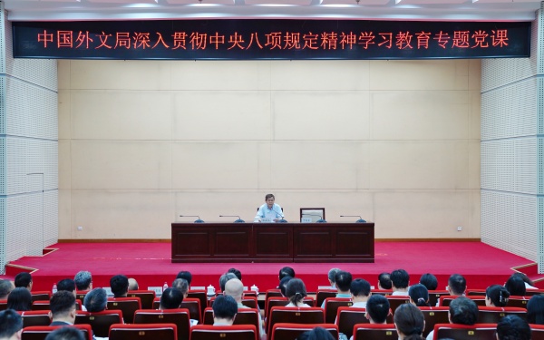 7月9日,中國外文局局長杜占元以“深入貫徹中央八項規定精神,以作風建設新成效開創世界一流國際傳播機構高質量發展新局面”為題,為全局黨員干部講授深入貫徹中央八項規定精神學習教育專題黨課。副局長于運全主持專題黨課,副局長余應福出席。